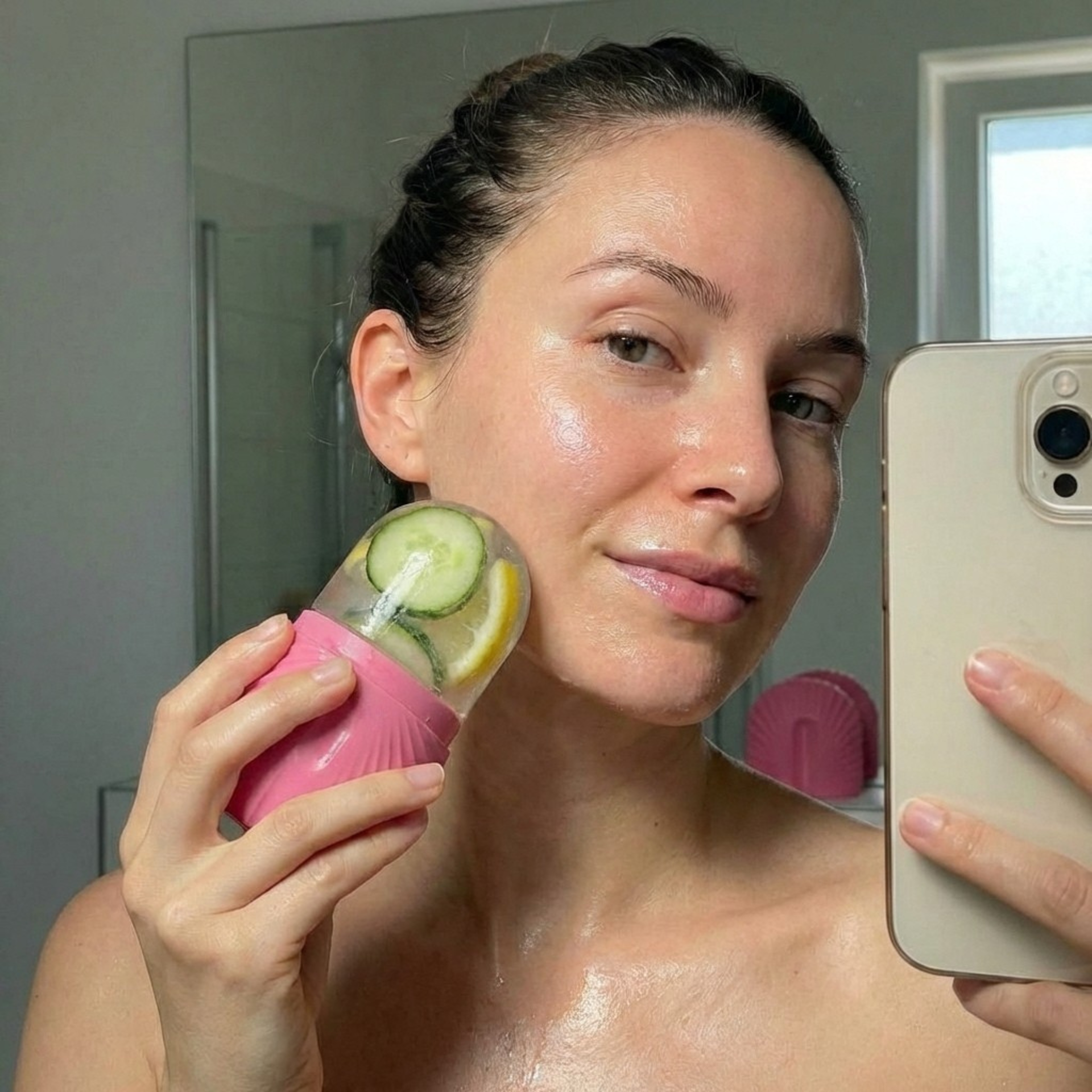 Fill with water or a liquid of your choice, freeze overnight, and in the morning, gently glide over your face and neck for 1–2 minutes.